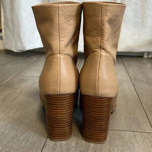 Excellent condition. Butter cream color soft leather boots with small peep toe. Loose sock style booties with 3 inch stacked wood block heel. Size 8.5 True to size