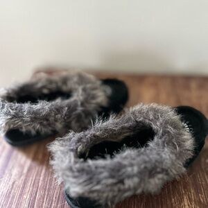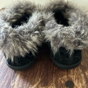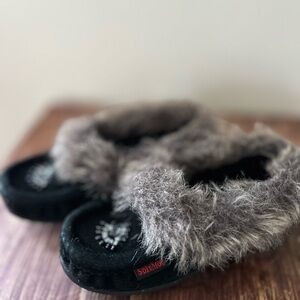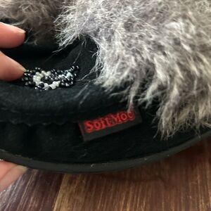 Cozy moccasins with fuzzy gray trim and intricate beadwork on black suede. Soft Moc size 1