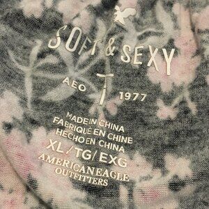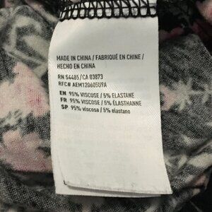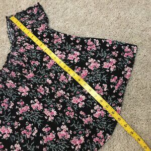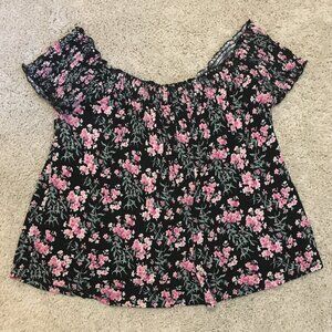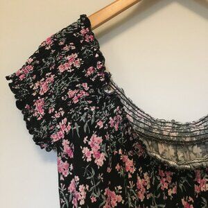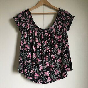 Good preowned condition, black, smock collar/ruched, off shoulder top by American Eagle Outfitters featuring tiny pink flower clusters with sage green leaves printed seamlessly throughout. Summer perfection.