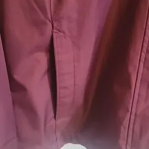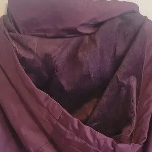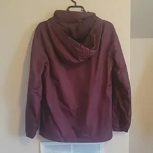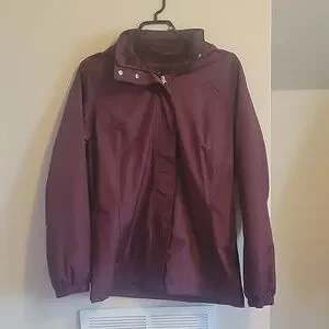 Plum coloured soft shell hooded jacket with fuzzy interior. Size small. Elastic at cuffs with zipper and snap closure. Pit to pit approx 20in. Length approx 27in. Shoulder seam to cuff approx 25in. Never worn.