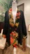 Beautiful Soft Surroundings black kimono-style jacket featuring vibrant Japanese-inspired floral brocade trim in shades of gold, red, and green. The contrasting collar, cuffs, and front placket showcase intricate patternwork that gives the piece an elegant artwear appeal. One large black statement button closure and soft draped hem with gentle side slits for movement. Made in the USA of imported fabrics, this piece blends comfort with sophisticated flair — perfect for casual elegance, art gallery strolls, or evening dinners.