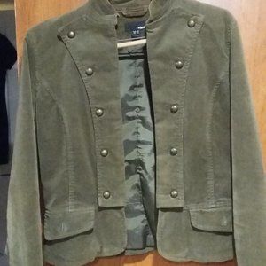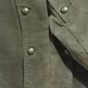This reminds me of a smart Union coat. It is in condition with buttons all the way down along front collar as well as sleeves. It closes with hooks and eyes. Size 8 to 10 very smart!
