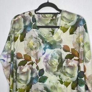 In good second hand condition. 96% polyester 4% spandex. Gently worn minor piling. Beautiful effortless look. Slits on the side. Round neckline. Measure lay flat: shoulder 16,5'' bust 21'' length 31'' sleeve length 25,5''.