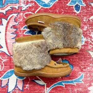 Material: Suede, Rabbit fur trim, Fleece lining, hand-sewn beading on the toe box, and a TPR outsole.