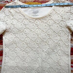 This T-shirt is in a cream colour and features roses in a lace pattern on the front.