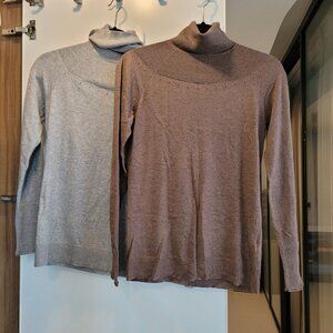 TWO soft smooth turtle-neck sweaters; neutral colour: one light gray and one warm tan/brown