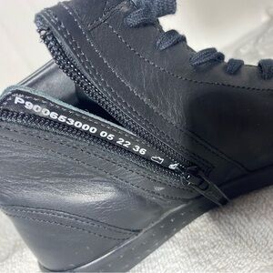 Stylish and comfortable black leather high top sneakers. Perfect for casual outings or a sleek urban look.