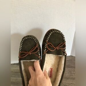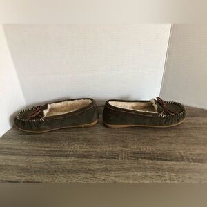 Comfortable suede moccasin slippers with plush lining. Hard bottoms perfect for winter. Keeps your feet cozy. Size 8. Style name is Bali Supreme. Olive green colour with off white interior.
