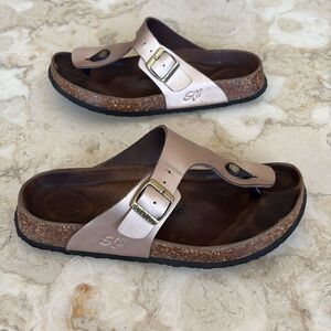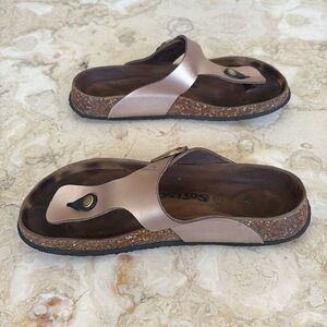 In very good preowned condition Softmoc Gizeh style sandals with a soft footbed and vegan uppers in a rose gold tone. These are super comfortable, cork is in excellent condition, still plenty of tread on soles, adjustable strap with gold tone buckle.