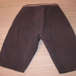 Ladies shorts 100% cotton Size 12. There is a front zipper closure and a metal button for fastening. The shorts have a pocket on each side at the front. There is a red and white stripe on the waistband. The length of the shorts is 22" from waistband to the bottom. This is a vintage item, hardly worn.