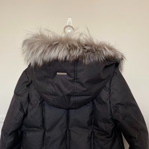 Elegant black puffer jacket. Features luxurious fur trim. Perfect for cold weather. Please note tags have since been removed.