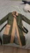 Elegant trench coat with olive and tan contrast. Features belted waist and button closure.