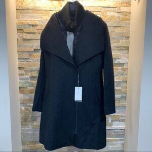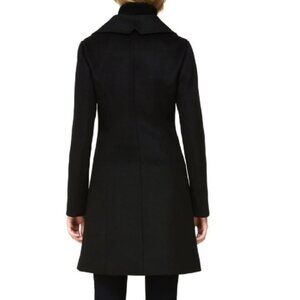 This modern, slim-fit mid-length wool-blend coat features a removable inner bib and metal detailing.