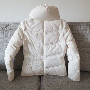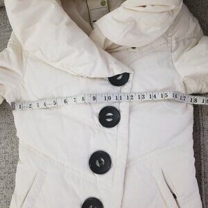 Soia & Kyo white down-filled puffer jacket with stylish neckline and cute large buttons.