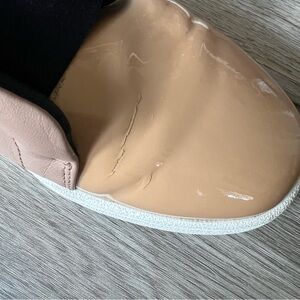 Patent and soft leather combo with large elastic panel. Great condition, tiny wearing marks near toe shown in closeups. Lots of life left.