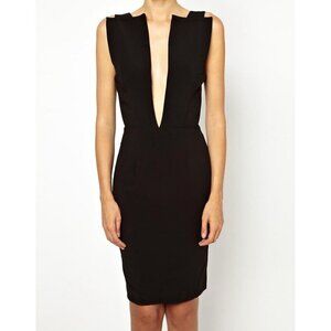 Features a bold plunge neckline, structured silhouette, and knee-length hem—perfect for cocktail events or formal occasions.