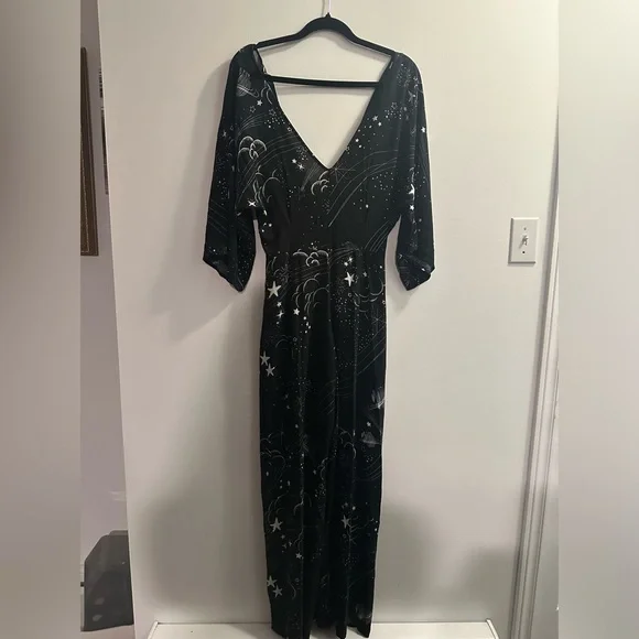 Black solar system jumpsuit. Has flared sleeves and flared legs (see photo). Has slit on bottom of each leg. Comes with a belt. Back is smocked.