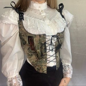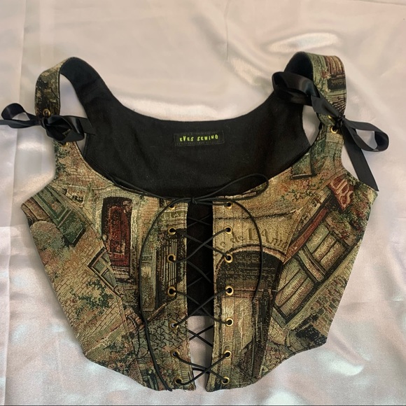 Features this French style tapestry fabric. Fully boned with rigiline. Front lace up closure with tie up straps. Fully lined with black canvas.