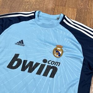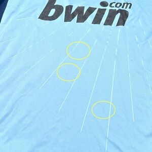 Used in very good condition. Some marks and spots on the front. Some curling on the front Real Madrid chest logo. Wear and slight peeling on the front BWIN logo.