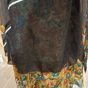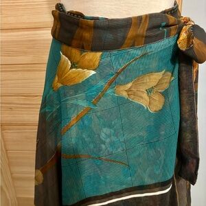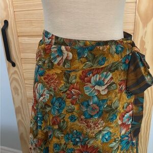 Vibrant floral wrap skirt with a tie detail. Features a mix of blue, red, and gold flowers. 50 x38 in no fabric tag (poly blend)