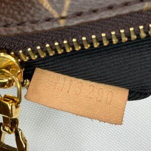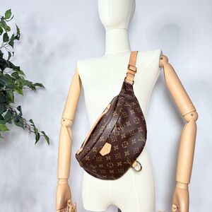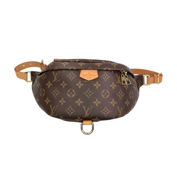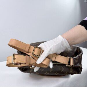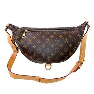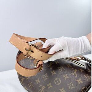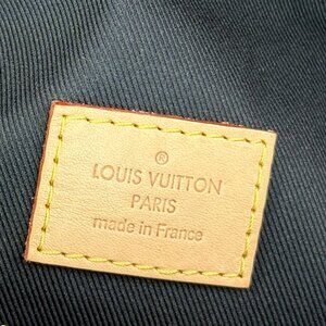 Monogram coated canvas, vachetta leather trim, adjustable belt strap, front zip pocket, top zip closure, gold-tone hardware. Versatile, discontinued, and highly collectible.