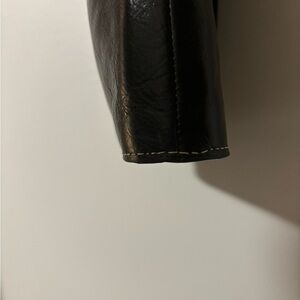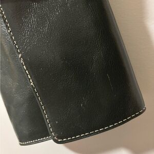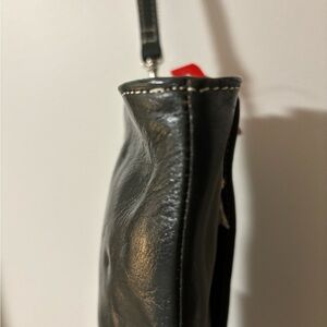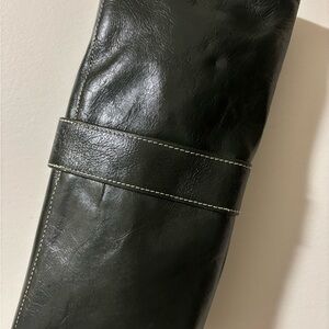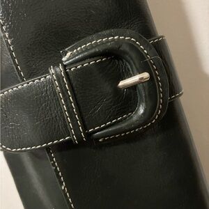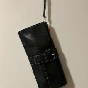 Sleek green clutch. Features a wristlet strap. Stylish buckle detail.