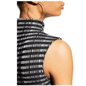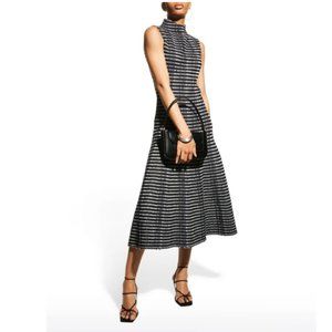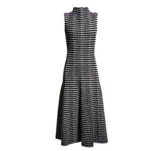 Sweet and simple!! St.Jhon’s sleeveless float knit dress is effortlessly chic. The designer opts for rayon/nylon/wool knitted material to make this dress. Vertical dual-tone lines are given with a mock neckline. The dress is a fit-and-flare silhouette; fits at the bodice and waist and loosens at the skirt. Concealed zipper gave for closure at the back. The dress has everlasting style and will not go out of fashion.