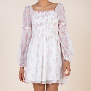 A chiffon dress in ivory and pink floral print. It has a smocked bodice and sheer long sleeves that can be worn on or off the shoulder.