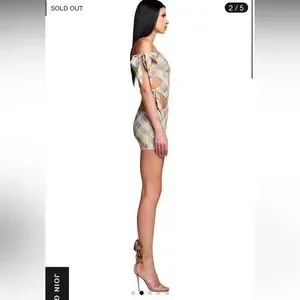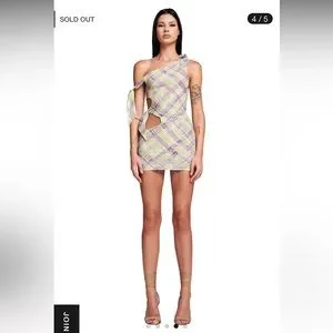 Mini dress in mesh fabrication and exclusive 'GIA' Check print. Featuring cut out and true-tie details on wearers right waist and hip. Asymmetrical off the shoulder dress with true ties straps. Bodycon silhouette. Fully lined in double mesh fabrication - Slightly sheer due to mesh fabrication but can be worn with nude undergarments.