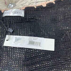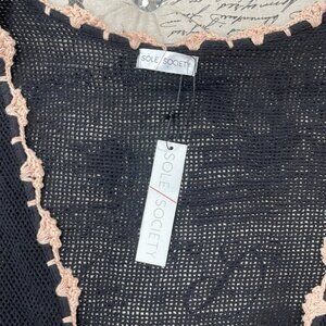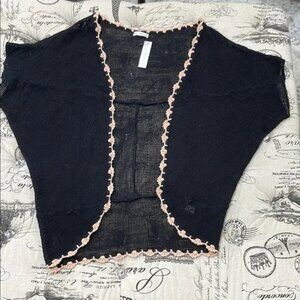 This black cardigan features a lightweight knitted design with a loose open weave, making it an ideal light cover-up. The elegant scalloped border adorned with light-colored beads adds a feminine touch, while the cropped length and short sleeves enhance its stylish appeal.