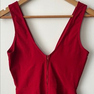 Striking red mini dress with incredible shape and structure. Features a deep V neckline with internal corset type piping, thick stretchy material for a form-fitting bodice, and subtle flared skirt for a flattering silhouette. Made with a spandex-blend fabric for comfortable stretch and movement.