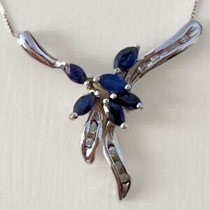 Solid 14k White Gold Cluster Pendant neckless with Blue Sapphire and White Diamonds- ALL REAL NATURAL STONES