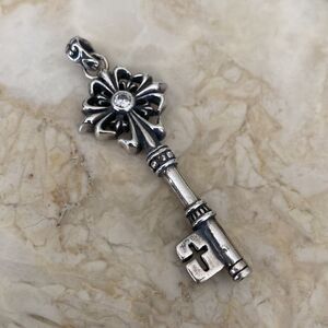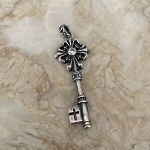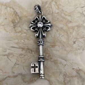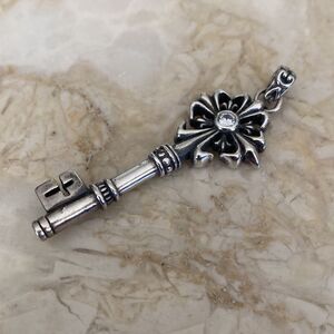 In perfect pre-loved condition gorgeous large and heavy solid sterling silver key. Stunning Fleur de Lys with a cubic zirconia in the centre. Ornate detailing, vintage old fashioned skeleton key style. This beautiful key would look amazing hanging from a long chain or even a black silk or leather cord.