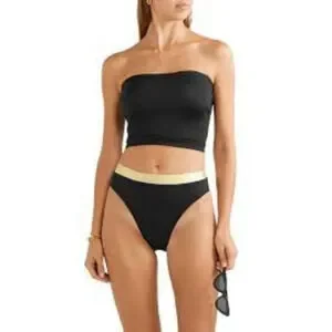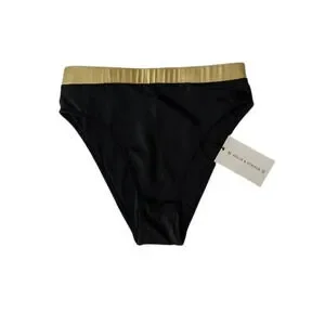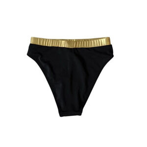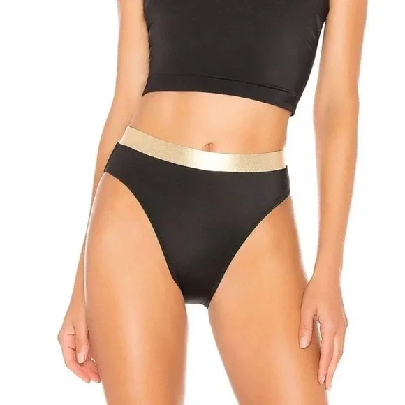 Black high rise bikini bottom with a metallic gold waistband by Revolve brand Solid & Striped.
