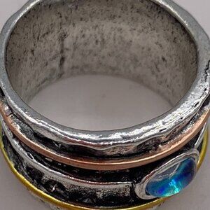 Solid sterling cigar band style ring with copper and gold accents. Man made opal centre stone. Hammered brutalist or artisanal finish, chunky look. New item size 7. Size 8 also available listed separately in Our Closet. A great way to integrate different metals for on trend look. Add finishing pieces from Our Closet (some suggestions shown all listed and priced separately in Our Closet), make a bundle to save a bundle. Different and daring for you from Lemon Squeezy Shop🍋