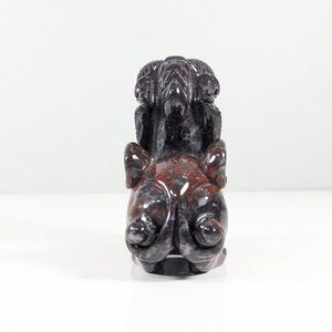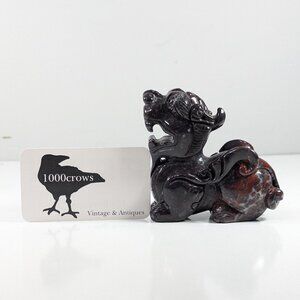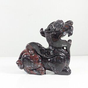A nicely hand carved and polished stone statuette of the mythical beast, Dragon Offspring Monster Pi-Xiu, also known as Pi Yao; a prominent mythical creature in Chinese culture. It's often referred to as a "Dragon Offspring Monster" due to its legendary status as the ninth son of the Dragon King and its fierce, hybrid appearance combining features of a dragon and a lion.