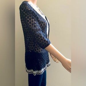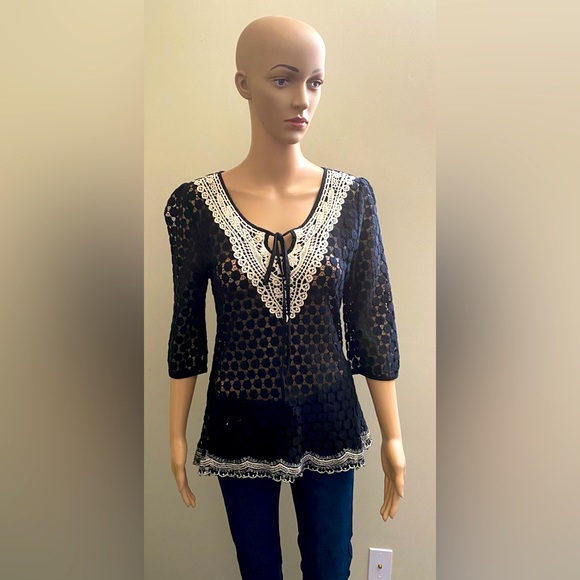 Black Crochet Top with Cream Color Lace Detail at Yoke. Lace Detail at Hem. 3/4 Sleeve.