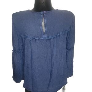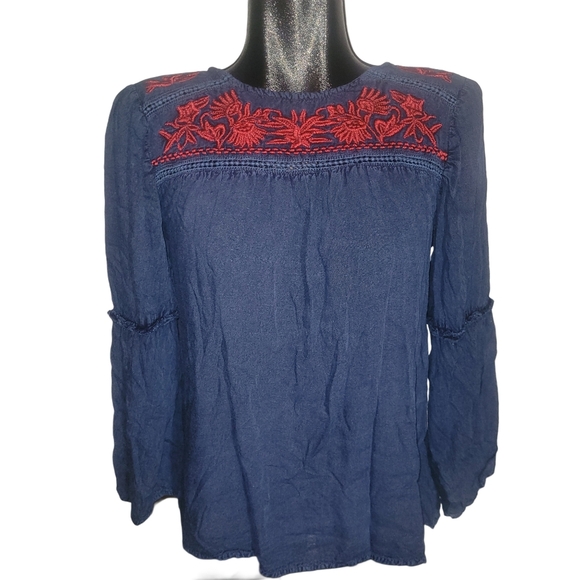 Solitaire Blue Long Sleeve Boho Chic Top With Red Floral Embroidered Detailing S