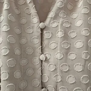 Elegant pink blouse with textured polka dot design. Features a drawstring waist and button-up front. Long sleeves for versatile styling.
