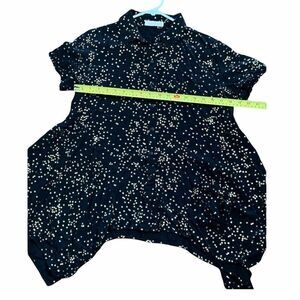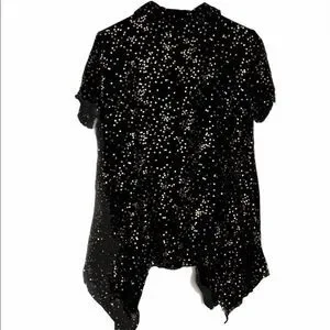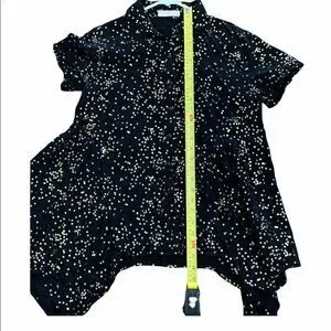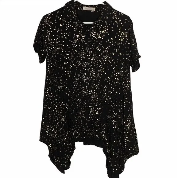 Metallic gold stars ⭐️ enhance this black top from Solitaire. Unique high low hemline. Button front. Size medium. Very good condition. See photos for condition and measurements.