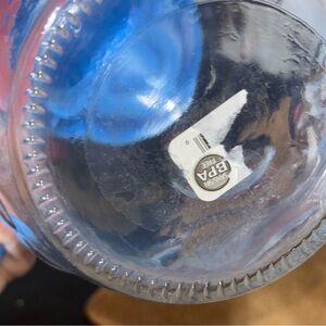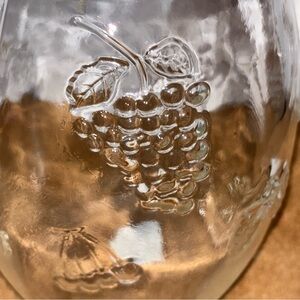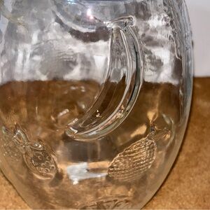 Vintage Circa 70's glass juice pitcher with a blue lid and an embossed fruit pattern is.
