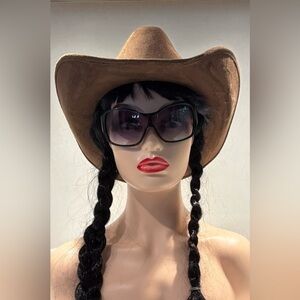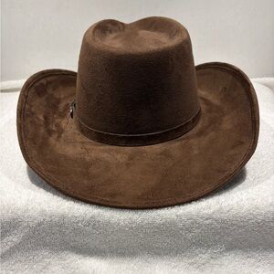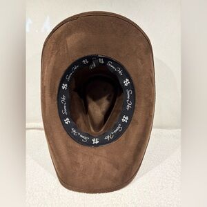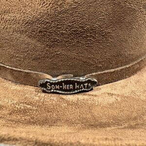 Saddle up in style with this classic Som-Her Hats cowboy hat in rich brown faux suede. Crafted in Mexico and sized XL (EG), this structured wide-brim hat features the signature Som-Her metal badge and embroidered interior band for an authentic Western touch. A bold statement piece perfect for rodeo nights, festivals, or everyday country flair. Appropriately 22.5” circumference.