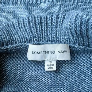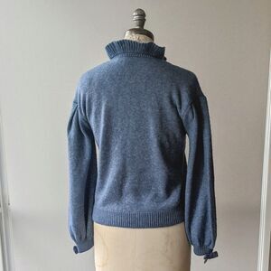 Something Navy, Size Small - Exquisite Ruffle Neck Knit Sweater with Puff Sleeve and a small bow at the wrist. This is in EXCELLENT condition. Soft blue that is flattering on many! Relaxed, Oversized Fit: modelled on a Size 8 Mannequin