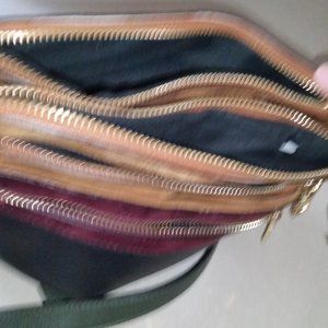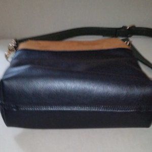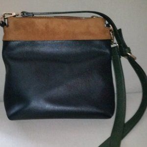 Sondra Roberts Squared black/crimson/tan/green crossbody bag. Plenty of room to hold all of your stuff with four separate zippered compartments and one domed interior compartment with one zippered and two open pockets. Crossbody strap is forest green adjustable and removable. NWOT