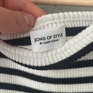 Classic with a twist—this black and white striped tank from Song of Style by Aimee Song is a wardrobe staple with Parisian vibes. Made from a soft ribbed knit, it features a slightly cropped fit, crew neckline, and wide straps. Easy to dress up or down, perfect for layering or wearing solo.