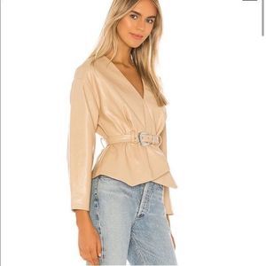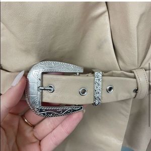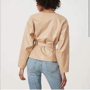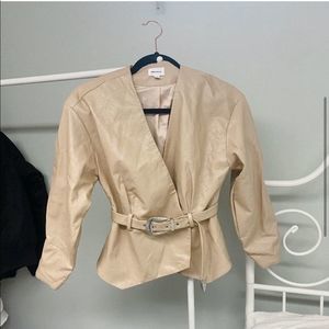 Great used condition! Song of Style belted faux tan yellow leather jacket. Only flaw is a small mark above the belt as pictured.