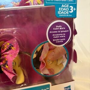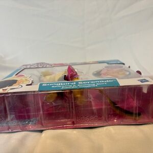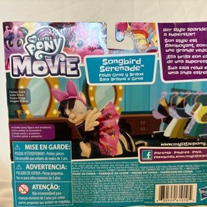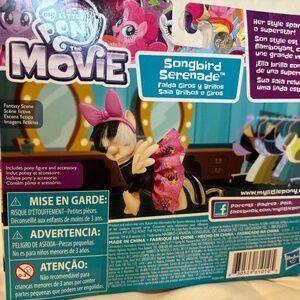 Welcome to the show! From the My Little Pony The Movie series, comes the song pony herself Songbird Serenade in this special edition set. Her style sparkles like a superstar! Songbird Serenade is in costume, with a sparkling multicoloured skirt, and a pink bow headband. Press the button on her flank and watch her skirt spin!