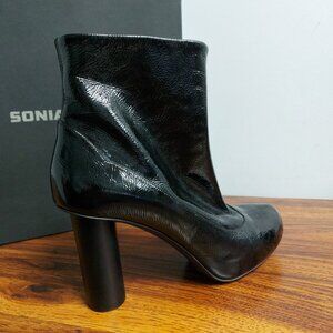 For sale: a stunning pair of Sonia Rykiel ankle boots, perfect for adding a touch of Parisian chic to your wardrobe! These Modello Tomaia 647906 51-001 boots in NOIR (black) are crafted with a glossy, patent leather finish, featuring a subtle crackle effect for a modern, edgy look. The boots have a sleek silhouette with a mid-calf height, a chunky 2.5-inch heel, and a round toe design, offering both style and comfort for all-day wear.