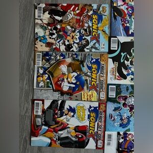Collection of vibrant Sonic the Hedgehog comic books. Features colorful covers with Sonic and friends.