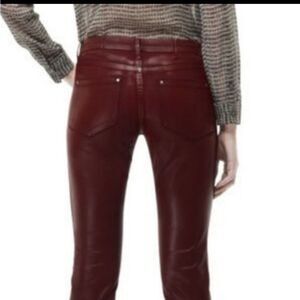Excellent condition burgundy waxed jeans from Club Monaco. The fabric is soft and flexible, and the wax on the outside gives them a great leather look.